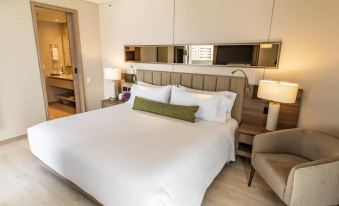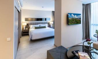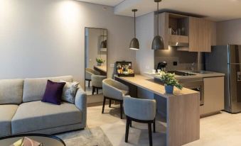 56sqm room consists of a room with a king bed, a bathroom, 400-thread-count bed linen, LÓccitane amenities, a living room, a fully equipped kitchen, and a 4K TV with DirectTV.