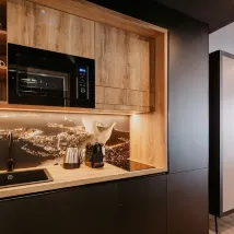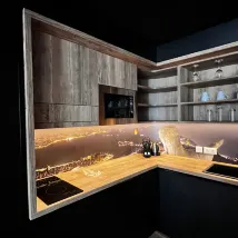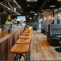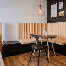 La salle dispose également d'un coin cuisine et d'un petit bar. L'aménagement est très chaleureux et épuré.