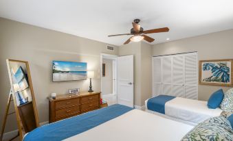 The second bedroom offers both a queen and twin bed, as well as a spacious dresser and plenty of closet space. The second bath is beautifully upgraded and easily accessible. The unit provides a stacked washer and dryer for your convenience, as well as kitchen soap, laundry soap and a variety of cleaning supplies.