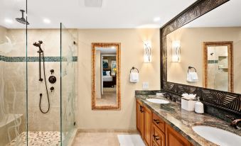 The spacious primary bedroom is outfitted with a king-size bed that is the ultimate in comfort. There is a full-size dresser and plenty of room in the closet for all your personal items. The beautifully renovated primary bathroom has a large shower with both rain and handheld fixtures, a beautiful etched glass mural and abundant counter space.