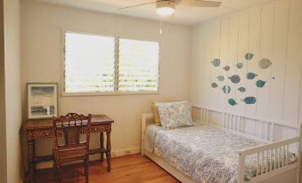 - 1 bedroom with a twin sized bed, a twin sized trundle and a desk