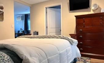 This relaxing and clean space includes a bedroom, living room, kitchenette, and 3/4 bathroom with a washer and dryer. The bedroom has a comfortable queen bed, a dresser, and two nightstands with convenient USB plug-ins to charge your electronics. Please help yourself to extra blankets from the dresser if you’d like.