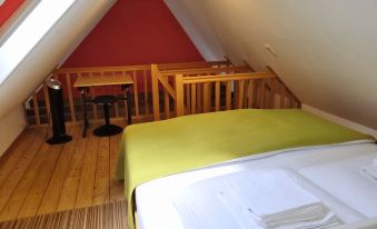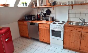 Enjoy your vacation in a beautiful, open-plan maisonette apartment with free 100 MBit WLAN, an inviting living area with sofa bed and bed (140 x 200 cm), dining table for four, hanging chairs, TV and an electrically adjustable desk. A large double bed (180 x 200 cm) in the upper bedroom ensures a restful night's sleep. The fully equipped kitchenette and the daylight bathroom with shower offer everything you need for a pleasant stay. Bicycles can be parked in the backyard. Dogs are very welcome.