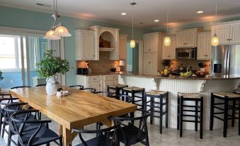 Open floor plan with kitchen, living area, and dining area with seating for up to 20. All cooking and eating necessities as well, including 2 coffee makers, 12 cup coffee machine and Keurig Coffee Machine in a dedicated coffee bar.