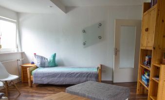 The sofa bed can also be converted into a large lying area (140x200), so that the living room can also be used as another bedroom / children's room. If desired, there is the possibility to add another single bed in the bedroom, so that a total of three separate beds are created.