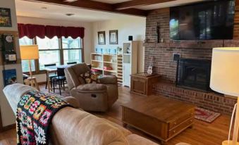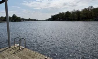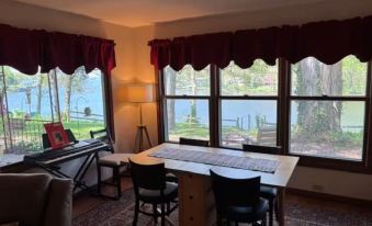 Open concept living, dining, and kitchen area with lake views. Kitchen has hot and cold bottled water dispenser, Keurig coffee maker, double oven gas stove, convection microwave, dishwasher, wide variety of pots and pans, utensils, silverware, plates, etc. Living room has reclining couch and easy chair, television, variety of puzzles and games, guitar, and digital piano. Dining area has table that seats four. Main bedroom has queen-size Sleep Number bed, closet, and television. Bunk room has two built-in bunk beds. Office has a couch and dedicated work area. Fast fiber internet with wifi throughout. Outside there's a porch with rockers, screened dining gazebo, and swimming dock.