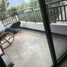 Nous avons été surclassés dans une chambre avec balcon. Le balcon a des montagnes en arrière-plan. Il y a un canapé dans le couloir à l'extérieur de la pièce où nous pouvons nous asseoir et prendre des photos.