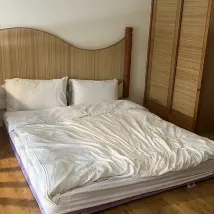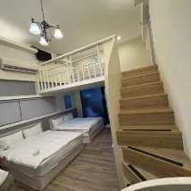 It is a two floors in one type of apartment and transform for bed and breakfast use. The two king beds is sufficient for two family with three members each. The bath tub is big enough for 4-5 people. Will come back again.