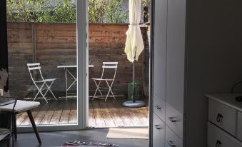 "On the ground floor" there is a bright bedroom with double bed, a bathroom with shower and toilet as well as a living and relaxation room with sauna next to the entrance area with a cloakroom. From this room you can access a small, secluded terrace with an outdoor shower and access to the garden.