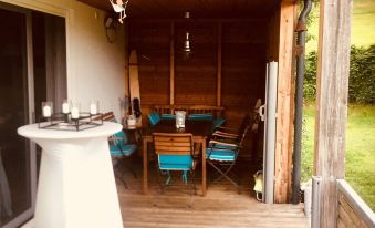 "On top" you will find a spacious living-dining room with a cozy old wood seating area for up to 8 people, a cozy sofa corner with a fireplace and access to the arbor, garden and balcony. The kitchen is fully equipped. You will find ceramic hob, oven, fridge-freezer, dishwasher and built-in coffee machine as well as sufficient dishes, cutlery and glasses. Another bedroom with a double bed and 1 children's room with a bunk bed complete the accommodation for 6 people. A folding bed can also be provided on request. The bathroom has a shower and whirlpool tub and a washing machine. The toilet is separate.