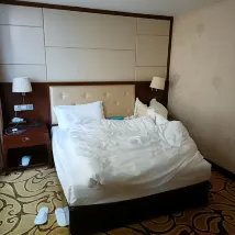 Réponse de l'établissement: 非常感謝閣下的入住與點評!感謝您的意見,在您入住期間,適逢國慶期,遊客較多,員工的工作量較大,讓您久等了,請見諒!你所反映的問題,我們已經馬上與洗滌公司溝通,要求洗滌公司要認真檢查,清理送洗的床單,尤其是床上用品,我們也會加強對酒店服務質量的提升,務求讓閣下入住有更為舒適整潔的環境,希望閣下下一次光臨有一個全新的感受!熱切期待再次光臨體驗!