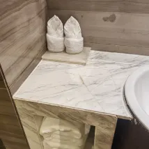Le personnel ne sont pas très accueillant. Aucune parle anglais et font pas d’efforts.les petits déjeuner ne donne pas envie. Étant asthmatiques j’ai eu du mal à respirer car les chambres étaient avec des moquettes et aussi enfermés de partout