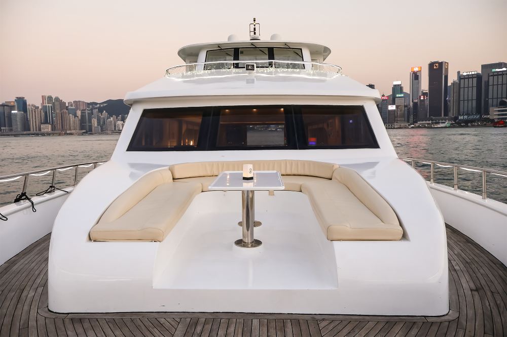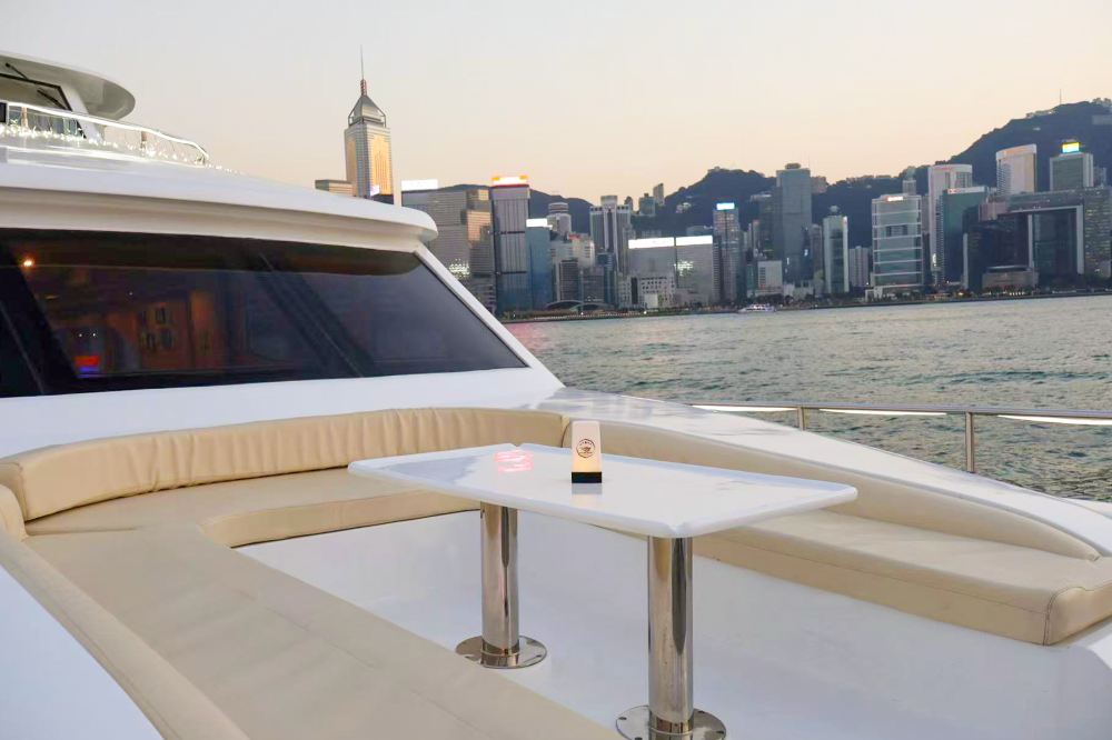 ▲ Sur le pont d'un yacht de luxe, la skyline de Hong Kong s'offre à votre vue