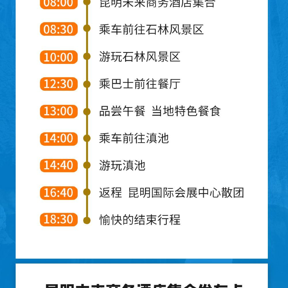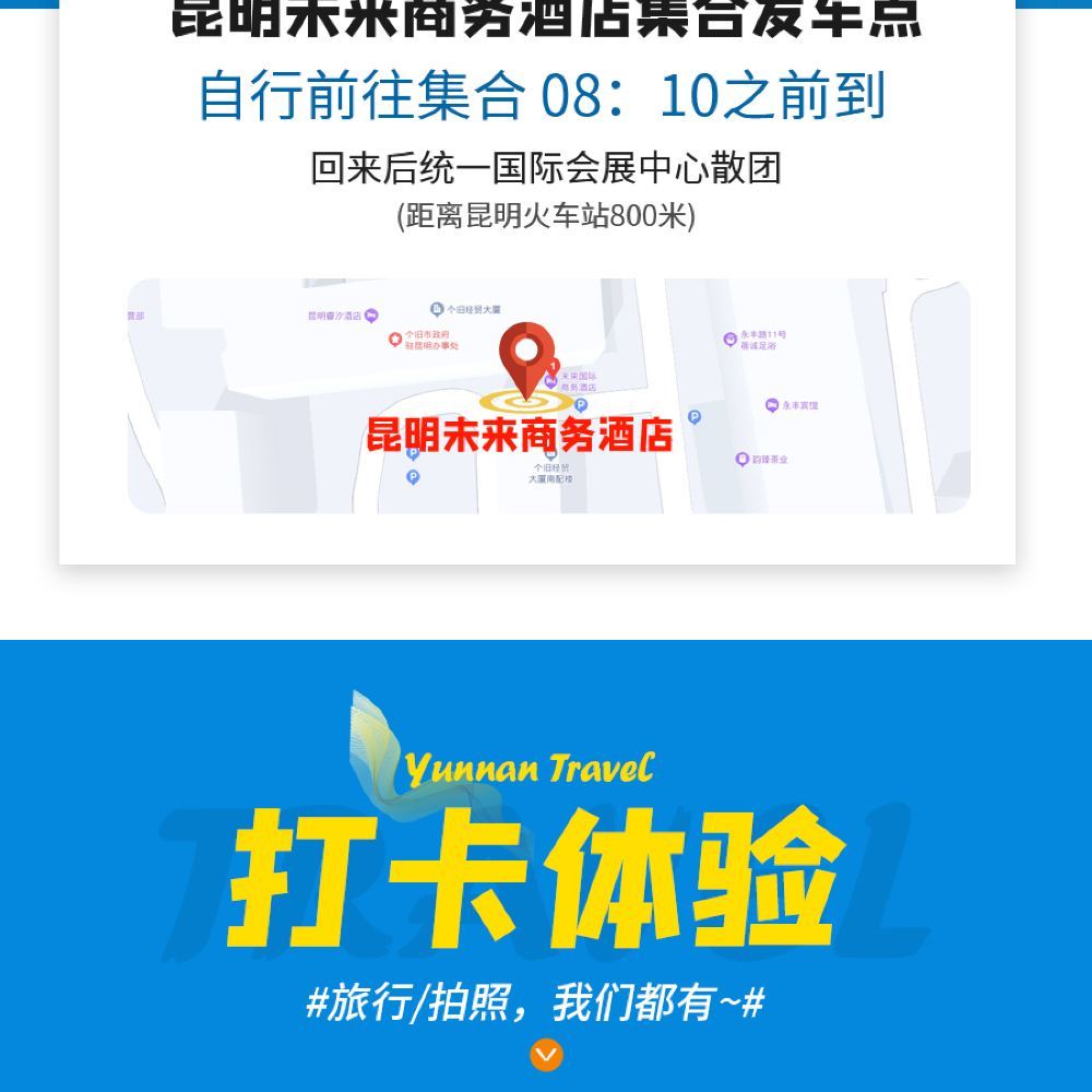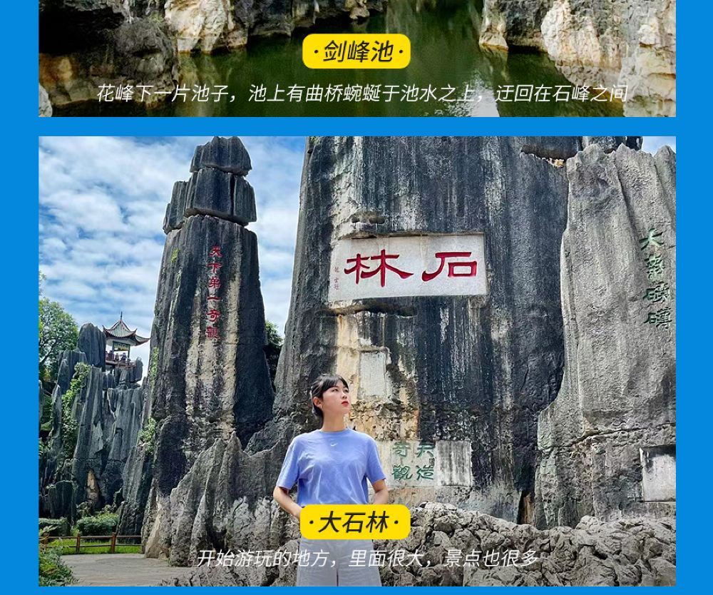 - [Rappel] En raison de l'affluence à la Forêt de Pierre le matin, nous sommes susceptibles de modifier notre itinéraire afin d'éviter les heures de pointe (visite du lac Dianchi le matin et de la Forêt de Pierre l'après-midi) et de vous offrir une meilleure expérience. Merci de votre compréhension !