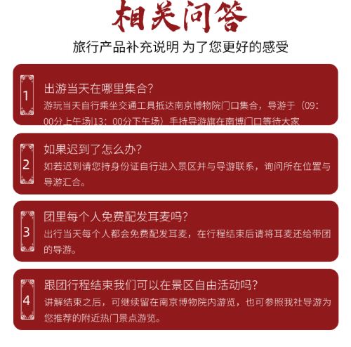 1. Les Guide touristique du Musée de Nanjing doivent également Billet d'entrée[l'entrée est autorisée deux fois par semaine], ce qui rend les Guide touristique relativement rares. Le programme des conférences peut être limité et nous devons coordonner les horaires des groupes. Nous vous remercions de votre compréhension et espérons que vous la comprendrez !
