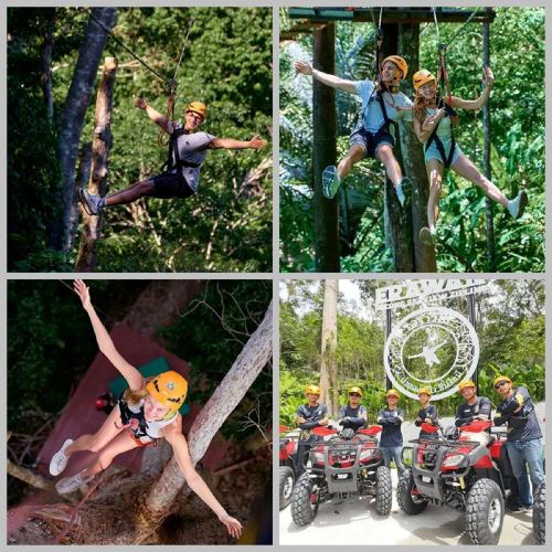(6 sections de tyroliennes, 1 section de 700 mètres de long + 1 section de 500 mètres de long, + 2 stations de rappel + 1 station de pont volant + 1 escalier en colimaçon + 1 section de skateboard Couple+ 10 minutes de marche en forêt tropicale)