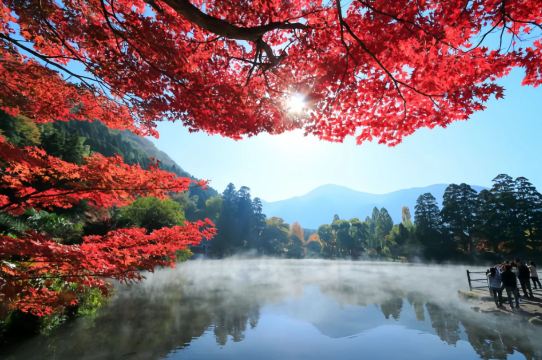 ▲ [Lac Kinrin] Ce lac est alimenté à la fois par de l'eau douce et des sources chaudes, ce qui maintient une température élevée toute l'année. Par les matins d'hiver, un spectacle enchanteur se produit lorsque la vapeur s'élève de la surface de l'eau. Le nom "Kinrin" (écailles dorées) vient d'un érudit confucéen qui, un jour au coucher du soleil, aurait aperçu un poisson doré dans ses eaux.