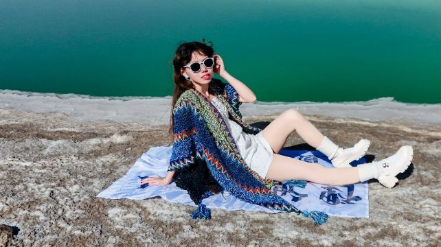 Lac de Jade de Dachaidan : Capturez sous plusieurs angles les lignes de séparation turquoise du lac salé, avec des photos dynamiques d'un foulard flottant au vent.