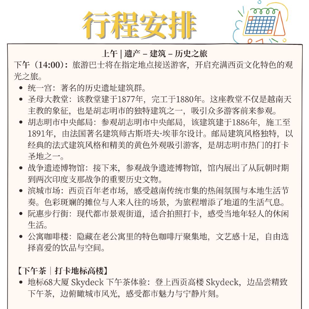 Ce voyage vous emmènera à la découverte des monuments emblématiques et des sites culturels de Hô-Chi-Minh-Ville : le Palais de la réunification, le Musée Des Vestiges De La Guerre, le Marché Bến Thành, la rue piétonne Nguyễn Huệ et le café populaire Apartment Cafe. En une journée, découvrez le riche patrimoine historique et la vitalité moderne de Saigon.